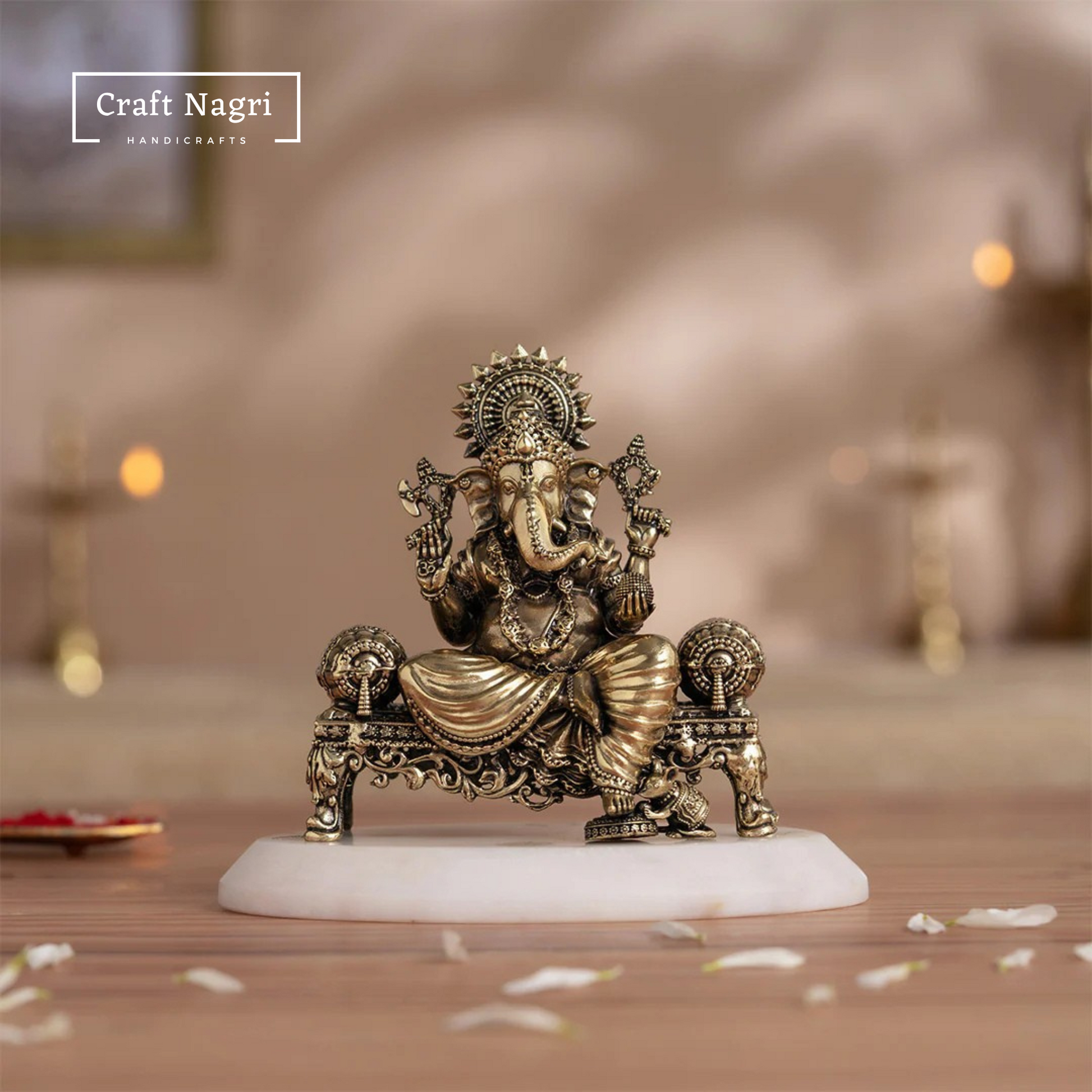 Elevate your space with this intricately detailed Brass Ganesha Idol, depicted seated on a majestic throne (Singhasan ). A symbol of wisdom and new beginnings, this artisan-crafted piece blends classical design with traditional aesthetics, making it an elegant décor item or Pooja Rooms and a thoughtful gift.