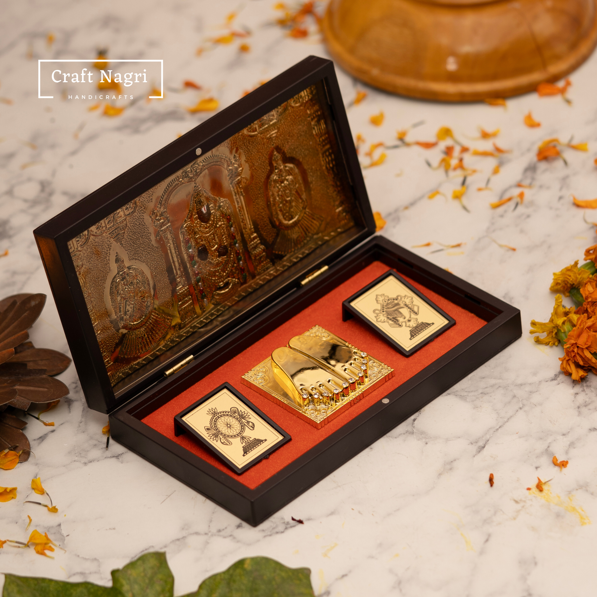 Seek the divine grace of Lord Venkateswara (Tirupati Balaji) with this beautifully crafted Pocket Temple. Designed with intricate gold-plated artwork, this compact temple features the sacred Charan Paduka, symbolizing devotion, prosperity, and divine protection.