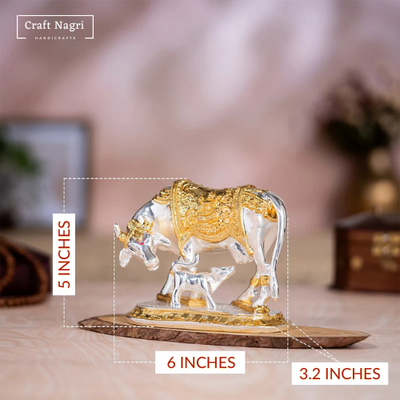 This exquisite Kamdhenu cow with calf idol, adorned in silver and gold plating, represents motherly love, prosperity, and divine blessings. A perfect addition to your pooja room, home, or office, this idol radiates spiritual energy and abundance.